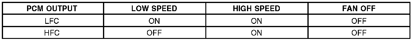For 2-speed fans, although the PCM output circuits are called low and high fan control, cooling fan speed is controlled by a combination of these outputs. Refer to the following tables.