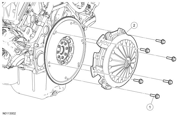 Remove the 6 clutch disc and plate assembly bolts by loosening them 1 turn at a time using the tightening sequence, then remove the clutch disc and plate assembly.