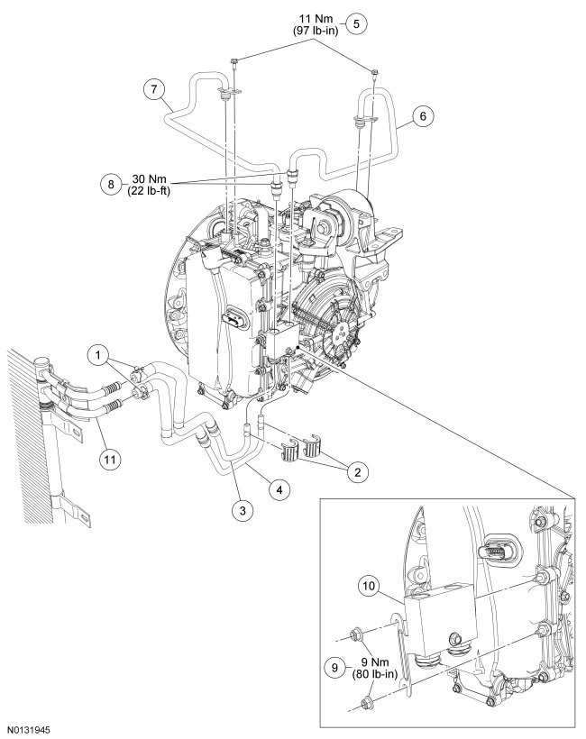 5. Install the transmission fluid cooler inlet and outlet tube and hose assembly in the transmission fluid cooler thermal bypass valve.