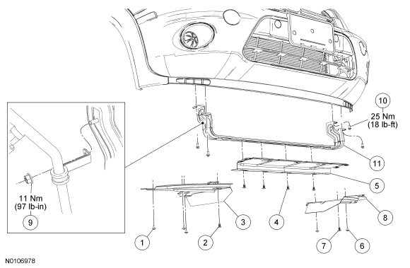 6. Remove the 2 LH lower splash shield screws, the LH lower splash shield pin-type retainer and the LH lower splash shield.