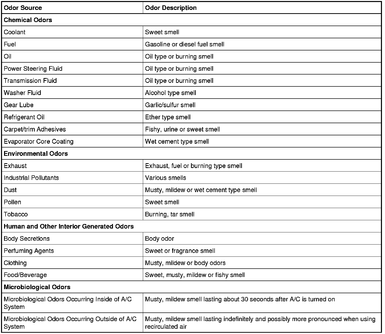 1. Identify the type of odor present in the vehicle. Do not proceed with A/C odor treatment if the odor source is found to be outside of the A/C system. Refer to the following chart for examples.