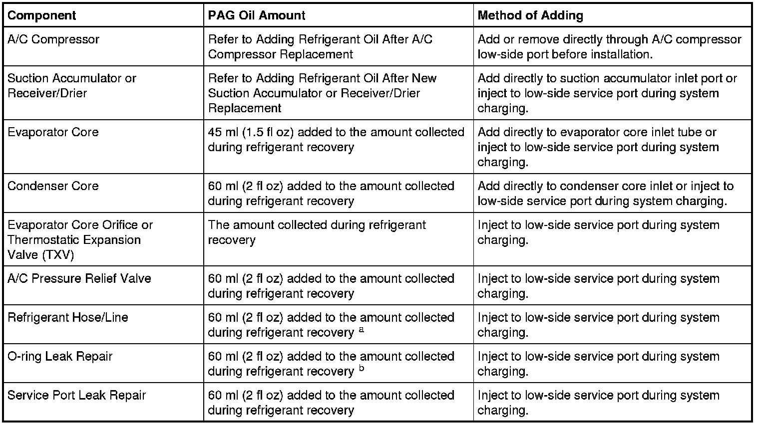a If an excessive amount of PAG oil is lost due to a hose rupture/separation or other damage, the total system PAG oil capacity must be added.
