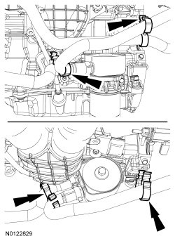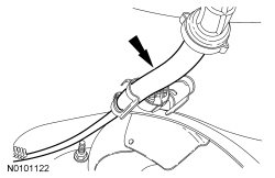 11. NOTICE: If coolant hose clamps are not positioned correctly the selector lever cable will rub on the coolant hoses.