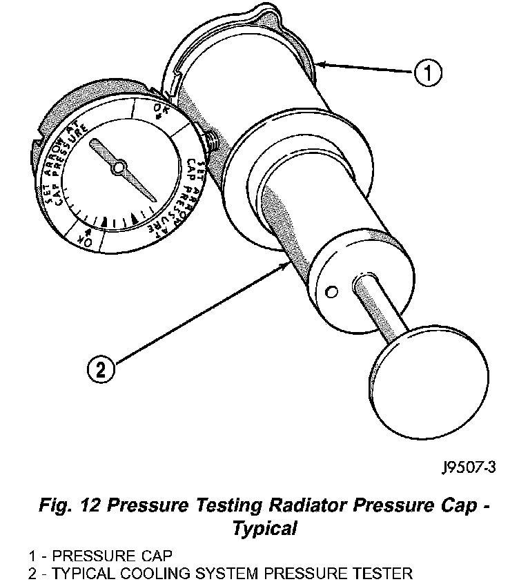 DIAGNOSIS AND TESTING - RADIATOR PRESSURE CAPRemove cap from radiator. Be sure that sealing surfaces are clean. Moisten rubber gasket with water and install the cap on pressure tester Tool 7700 or an equivalent (Fig. 12).