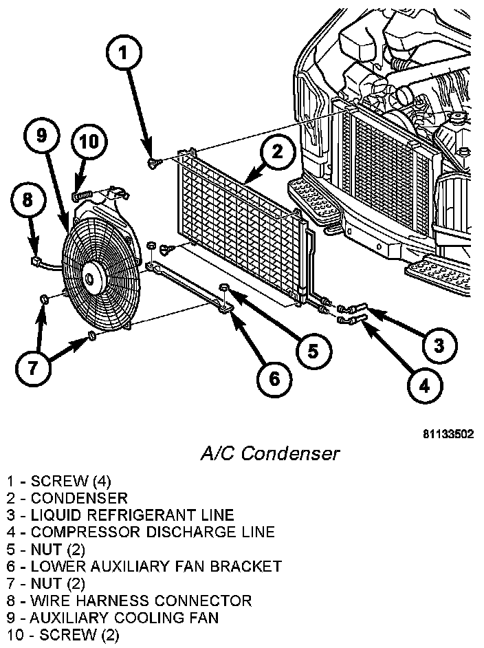 NOTE: If the A/C condenser is being replaced, add 30 milliliters (1 fluid ounce) of refrigerant oil to the refrigerant system. Use only refrigerant oil of the type recommended for the A/C compressor in the vehicle.