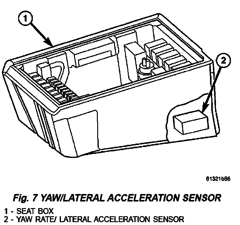 The Yaw Rate and Lateral Acceleration Sensor is housed into one unit (Fig. 7) (each individual sensor can not be replaced separately the whole housing unit must be replaced when servicing). The sensor is used to measure side to side (Lateral) motion and vehicle rotational sensing (how fast the vehicle is turning). This is a 6-wire sensor with all six wires connected to the ESP/ABS module.