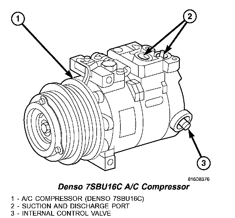 The standard front A/C system uses a Denso 7SBU16C seven cylinder, variable displacement swash plate-type A/C compressor. This A/C compressor has a volume control which is regulated by an internal control valve and has both the suction and discharge ports located at the rear of the compressor.