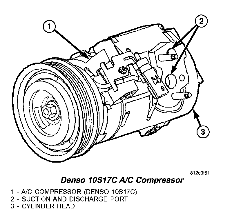 The optional independent Konvekta rear A/C system uses the Denso 10S17C ten cylinder, double-acting swash plate-type A/C compressor. This A/C compressor has a fixed displacement of 170 cubic centimeters (10.374 cubic inches), and has both the suction and discharge ports located on the cylinder head at the rear of the compressor.