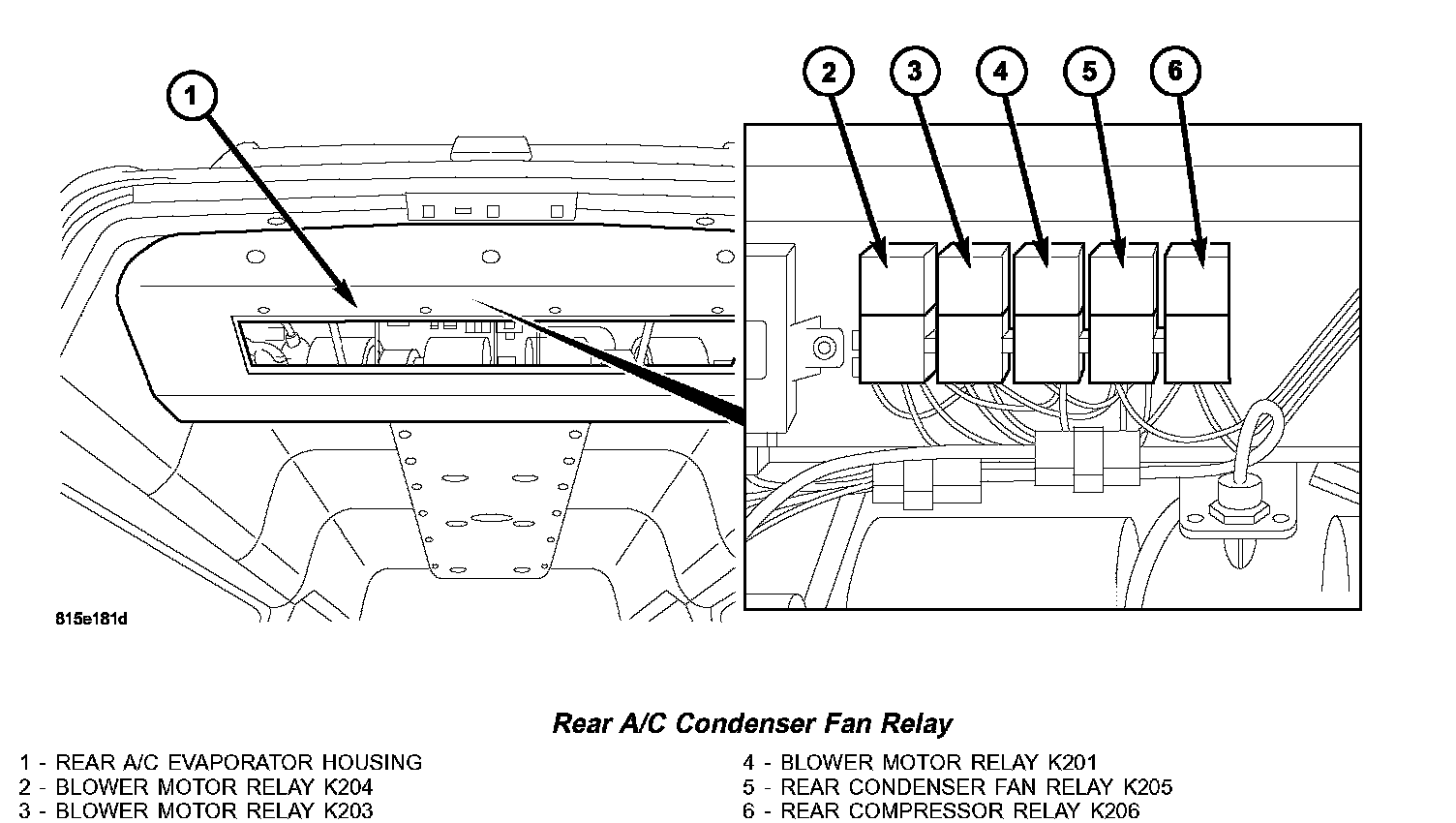 1. Position the rear A/C condenser fan relay into the proper receptacle of the relay block located in the rear A/C evaporator housing.