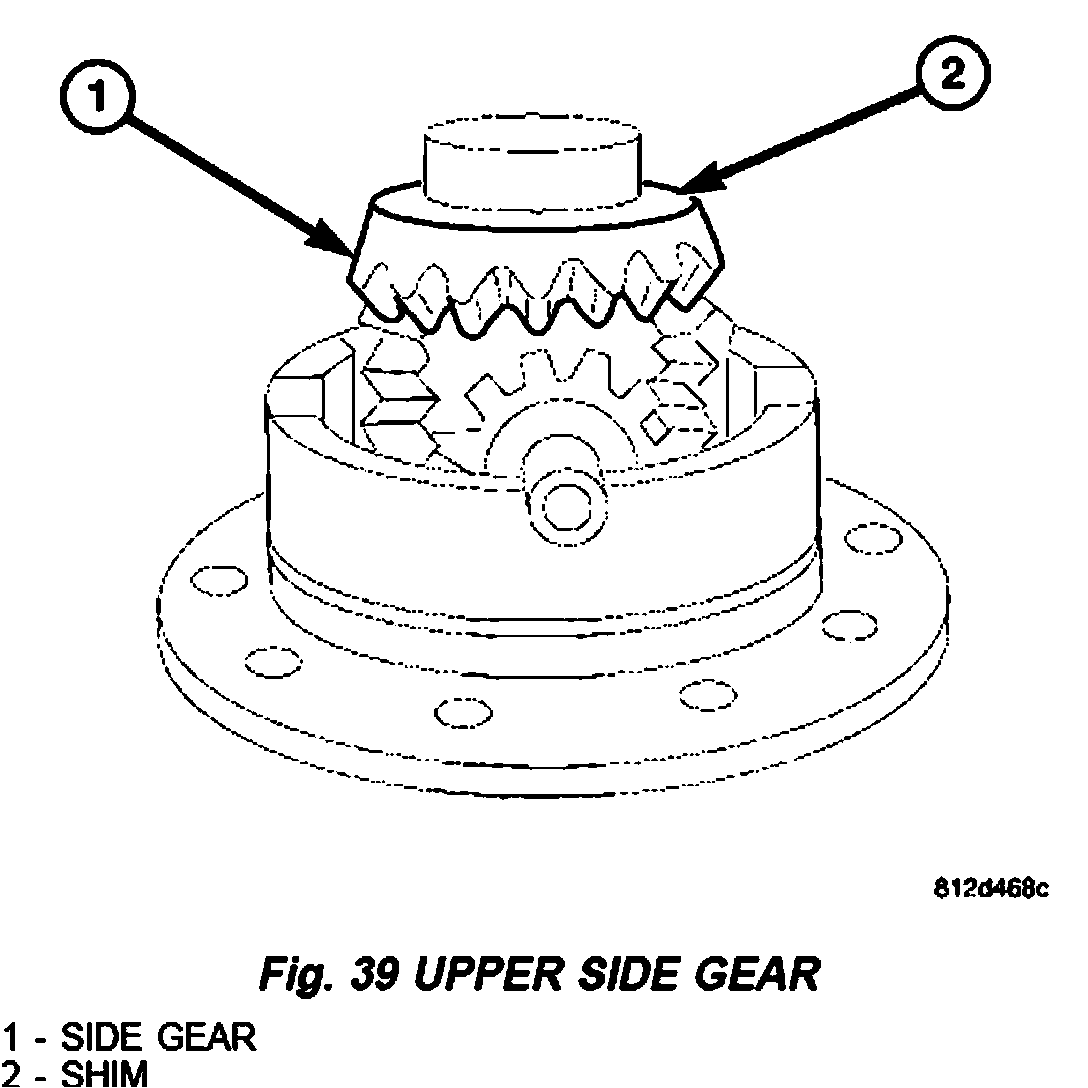 2. Remove upper differential side gear (1) and shim (2) (Fig. 39).