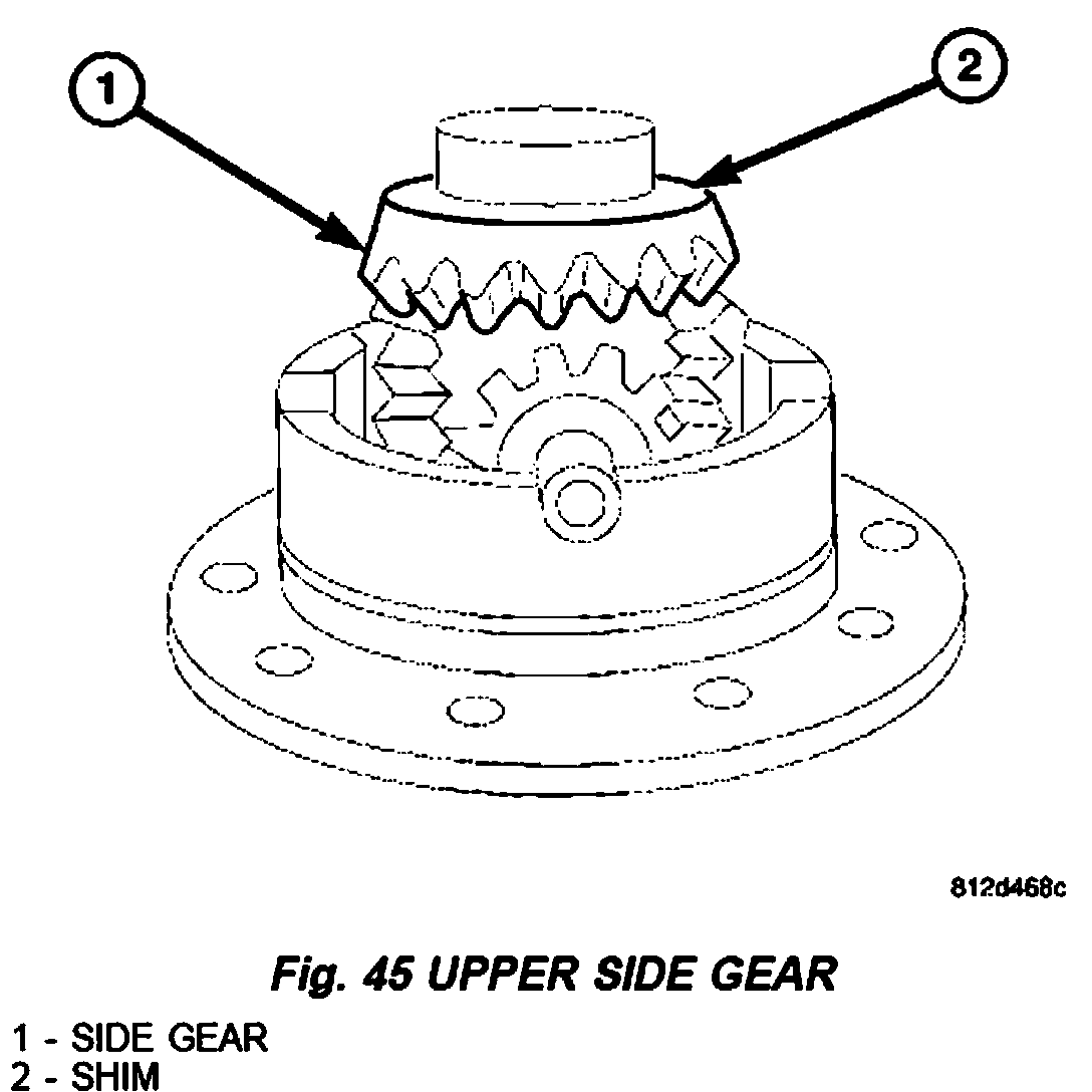 4. Install upper differential side gear (1) and shim (2) (Fig. 45).