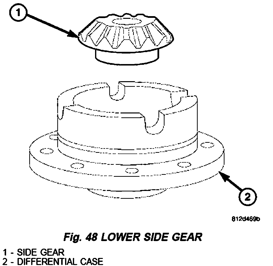 1. Install lower differential side gear (1) and shim (Fig. 48).