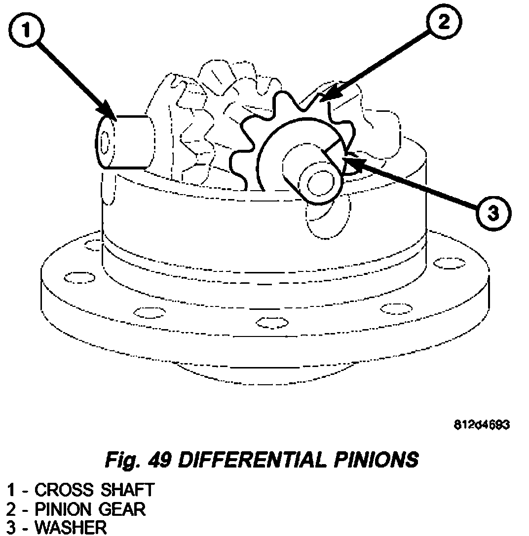 2. Install first differential pinions gears (2) with spherical washers (3) and cross shaft (1) (Fig. 49).
