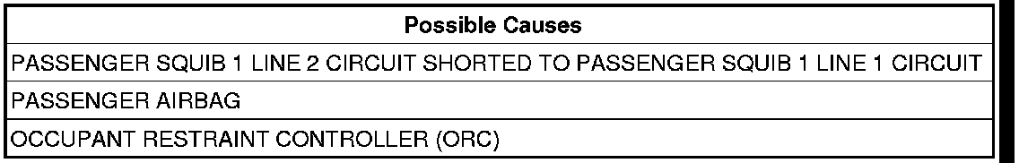 The Occupant Restraint Controller (ORC) monitors the resistance of the Passenger Squib 1 circuits. The ORC will set this DTC if it detects low resistance between the Passenger Squib 1 circuits.