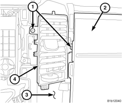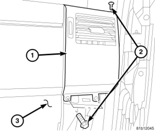 11. Install the three screws (2) that secure the air outlet to the front face of the instrument panel. Tighten the screws to 2 Nm (17 in. lbs.).