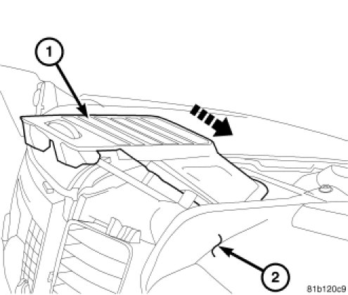 1. Position the air outlet (1) to the top of the instrument panel (2) and align the outlet with the instrument panel duct opening.