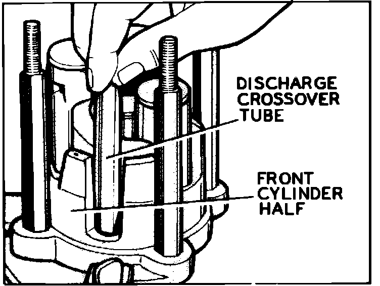 6. Without using any O-rings or bushings, assemble one end of new discharge cross-over tube into hole in front cylinder half, Figs. 43 and 44, ensuring flattened section of tube faces inside of compressor to allow for axial clearance.