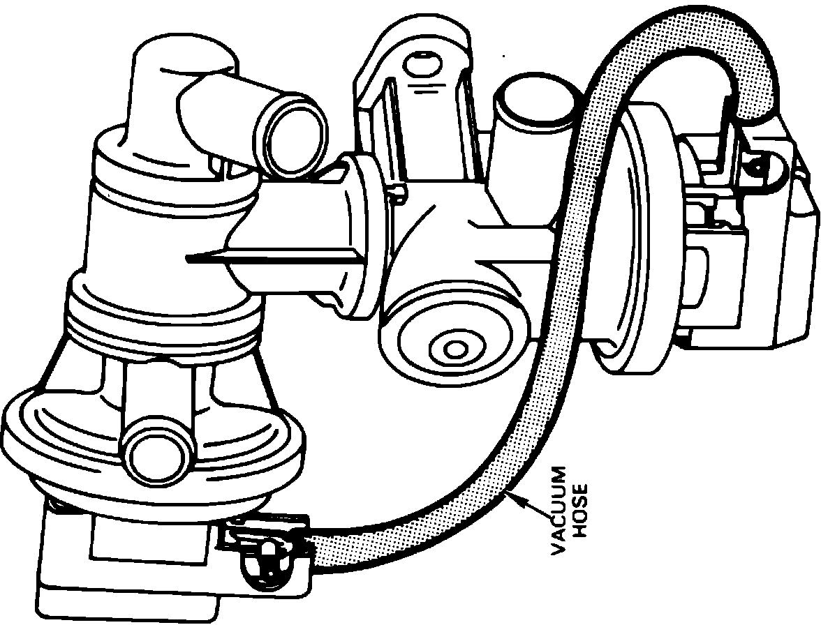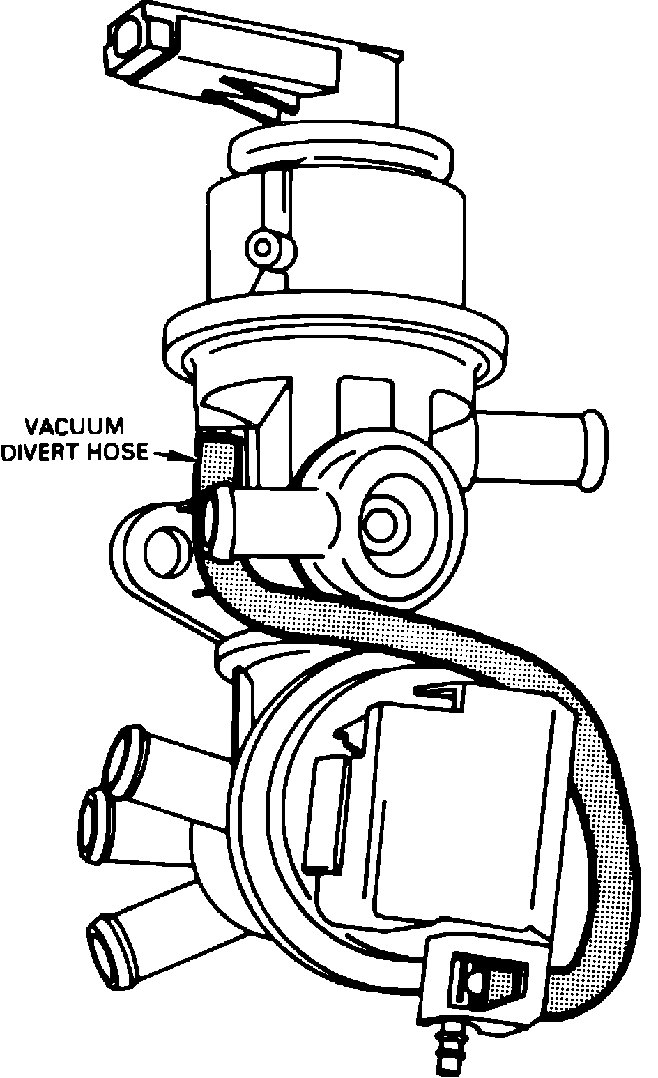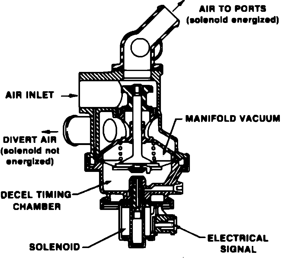 The ASV directs air pump output into the injection manifold or diverts the air to atmosphere. In addition, an internal bleed allows a small portion of the air pump output to be directed to the VSV to act as a control signal. When vacuum is applied to the ASV control valve diaphragm, the control valve opens the passage to the injection manifold and air is injected into the exhaust stream. When pressure is applied to the control valve diaphragm, the control valve closes the port to the injection manifold and opens the air divert port, diverting air pump output to the air cleaner.