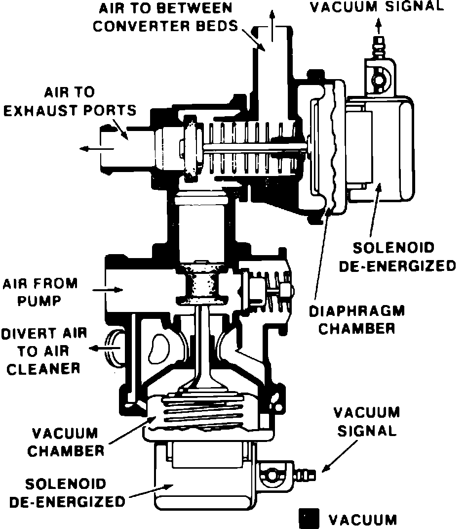 This system is used on models that do not require air injection into the catalytic converter, and is controlled by an Electronic Control Module (ECM). When engine is operating in ``Open Loop'' mode, the valve is energized and air pump output is directed to the exhaust ports. However, a sudden rise in manifold vacuum will close the valve, momentarily diverting air to the air cleaner. When engine is operating in ``Closed Loop'' mode, the valve is not energized and the vacuum signal is blocked. Air pump pressure closes the valve and air is diverted to the air cleaner.