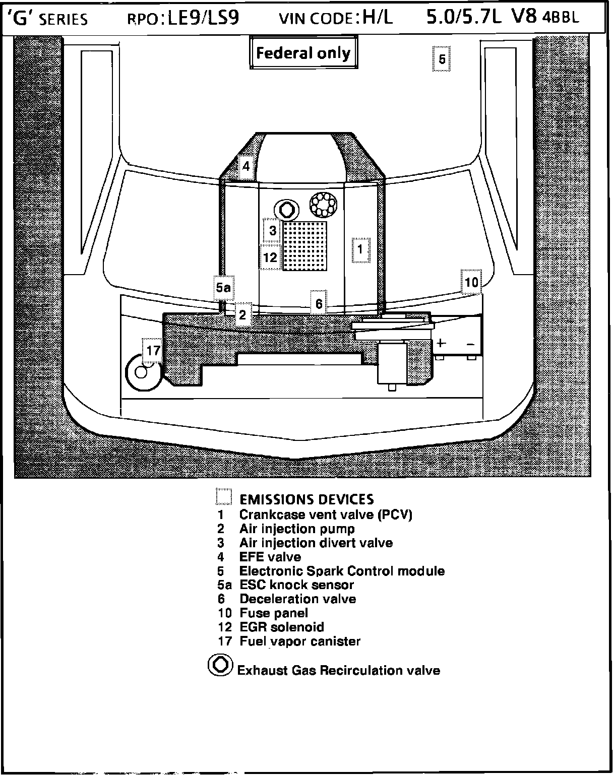 Fig. 110 Emission components locations. 1985-86 V8-305 & 350 G Series light duty emissions except Calif.: