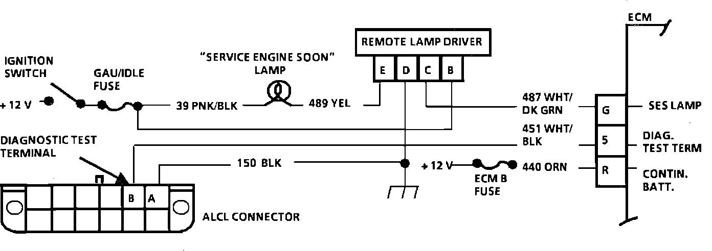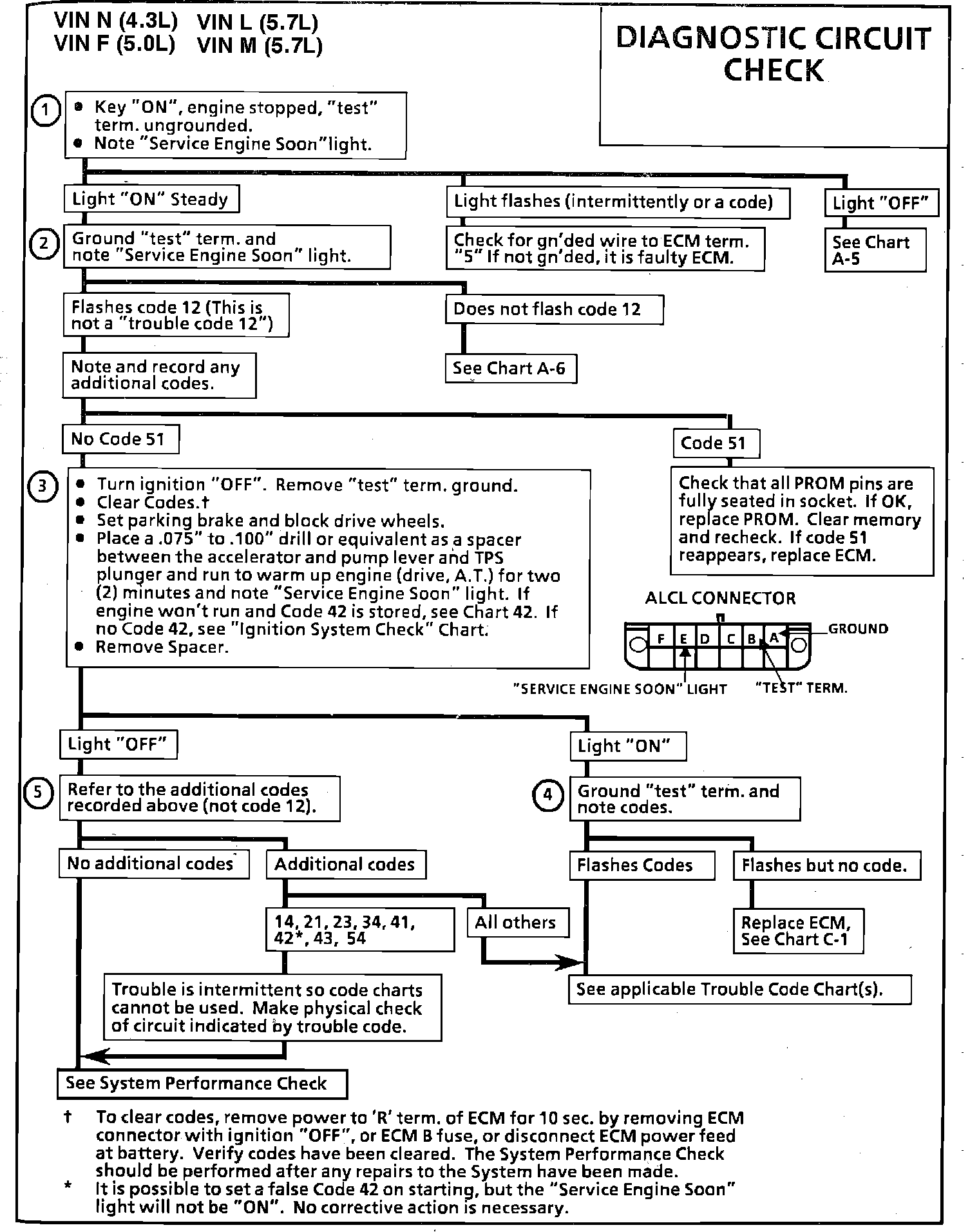 2. Grounding the test terminal will flash a Code 12 and any stored trouble codes. The light must go "ON" and "OFF" for a proper code. If the light goes from "Bright" to "Dim" this is not considered a code. See Chart A-6 in that case.
