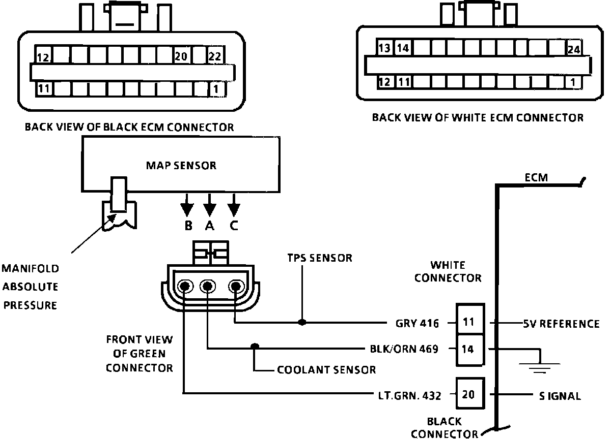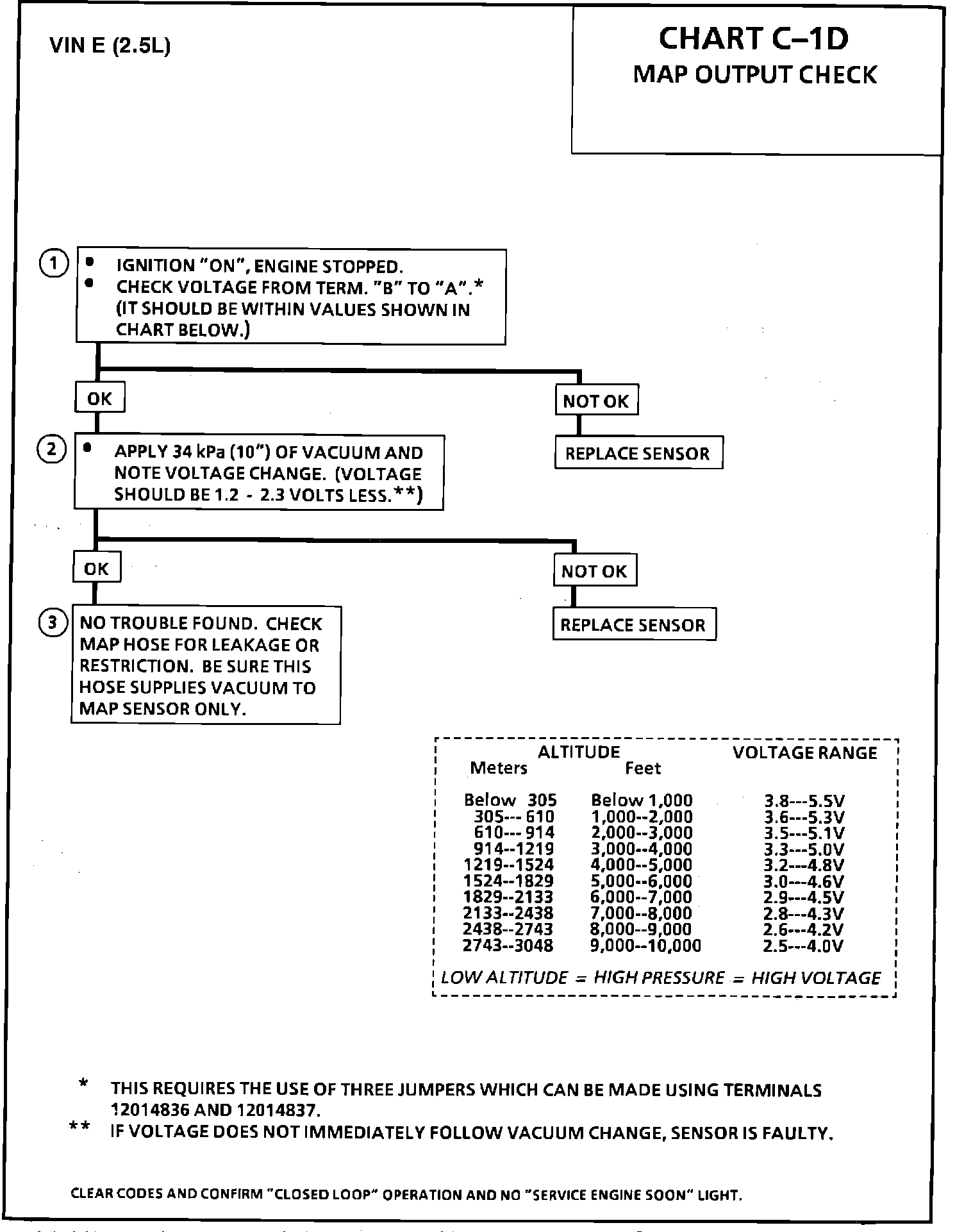 1. Checks MAP sensor output voltage to the ECM. This voltage, without engine running, represents a barometer reading to the ECM.