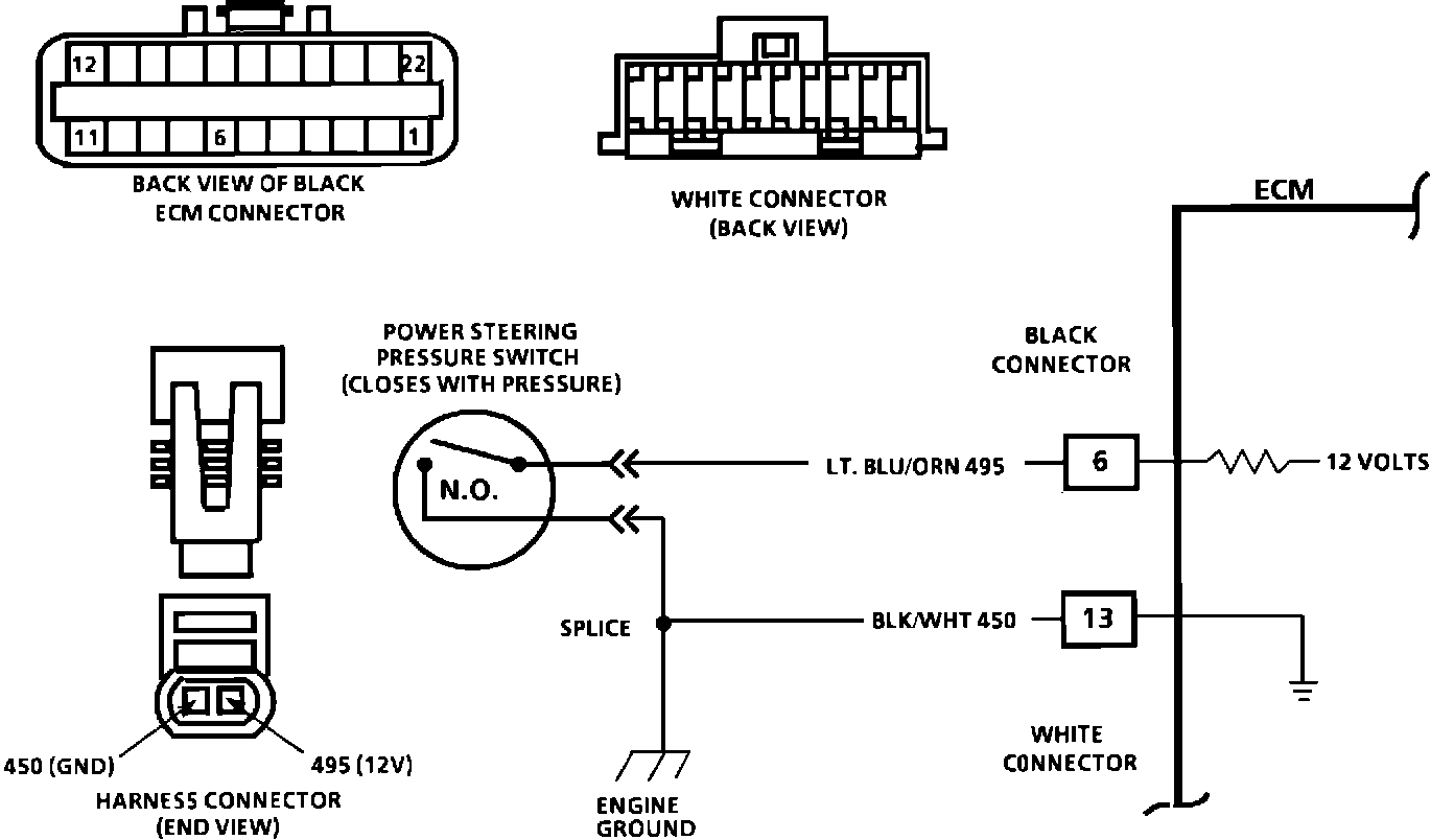 The power steering pressure switch is normally open to ground, and circuit 495 will be near battery voltage.