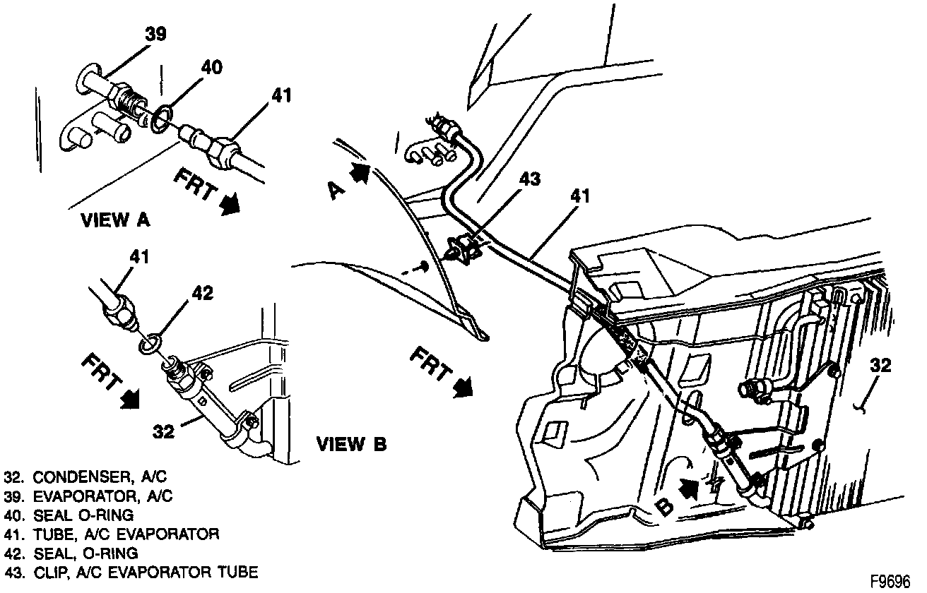 The Expansion Tube is located in the evaporator inlet pipe (high side line) at the liquid line connection.