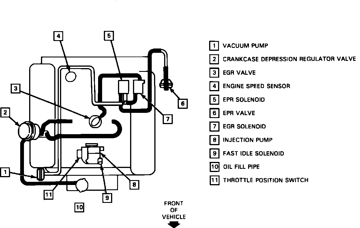 Fig. 117 Emission components locations. V8-379 Diesel G Series light duty emissions; 1985 except Calif.; 1986-87 All: