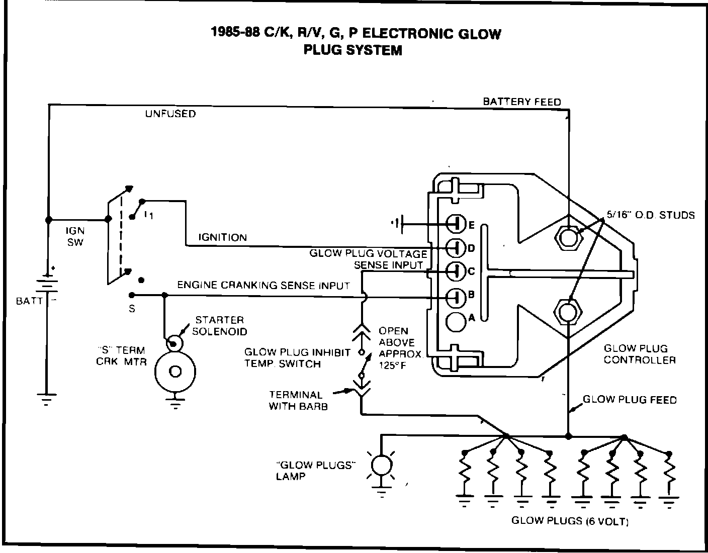 The 1985-88 6.2L diesel engine glow plug system consists of an integral-electronic controller glow plug relay assembly, 6-volt glow plugs, a glow plug light, and a glow plug inhibit temperature switch.