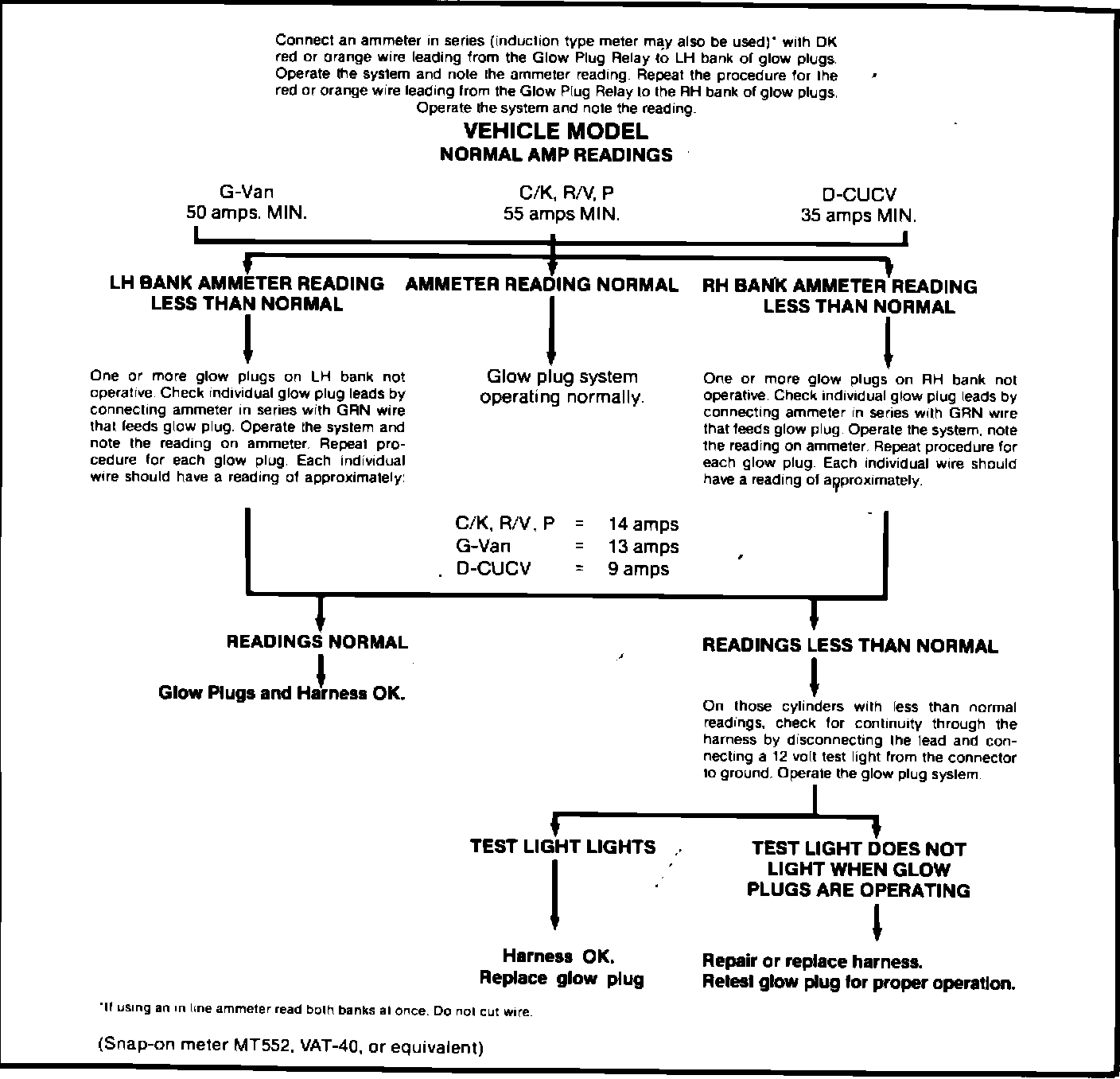 The following procedure provides a fast way to determine whether the glow plug system is functioning correctly or if you have another condition to contend with. It is suggested that this procedure be performed whenever there is doubt about correct system operation. Then refer to the diagnosis charts that follow to pinpoint the condition.