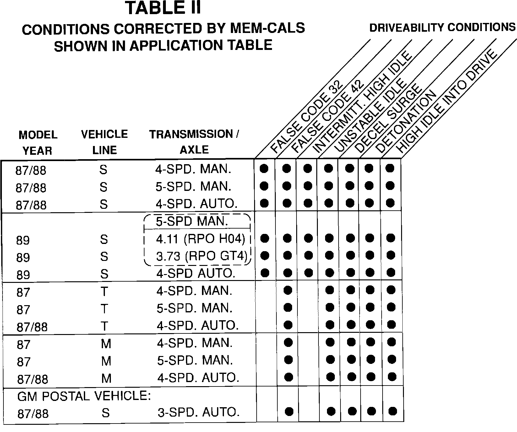 If these conditions are experienced and cannot be corrected through normal service procedures, they may be repaired by installing the appropriate MEMCAL kit as shown in Table I, "Application Table." The driveability and false code conditions that are corrected by the MEMCAL kits for each specific vehicle application are shown in Table II. Listed below are some symptoms and circumstances of the driveability conditions and false codes: