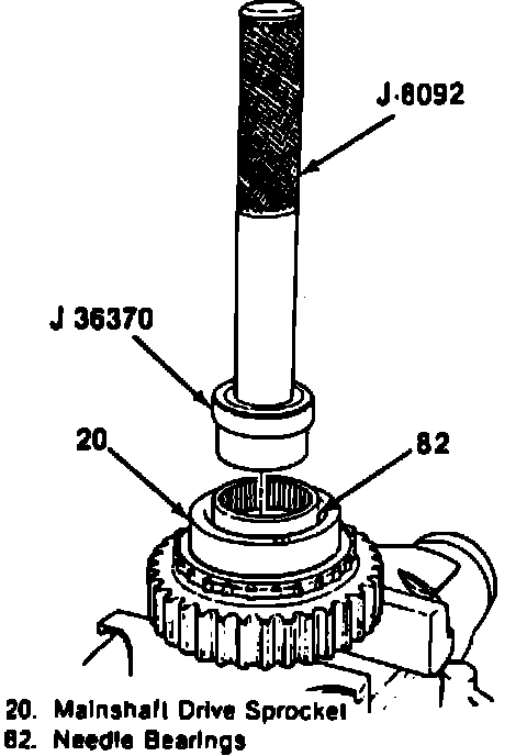1. Install needle bearings to drive sprocket using J-36370 and J-8092. On model 241, ensure that sprocket is flush on synchronizer side. Refer to Figs. 25 through 32 for aid in assembly of transfer case.