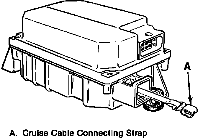 The cruise control module, Fig. 1, houses an electronic controller and an electric motor. The controller monitors vehicle speed and operates the motor accordingly. Desired cruise speed is maintained as the motor moves a connecting strap and throttle linkage. A low speed limit in the module prevents engagement of the system at vehicle speeds below 25 mph. Controller operation is varied by mode control switches on the turn signal lever.