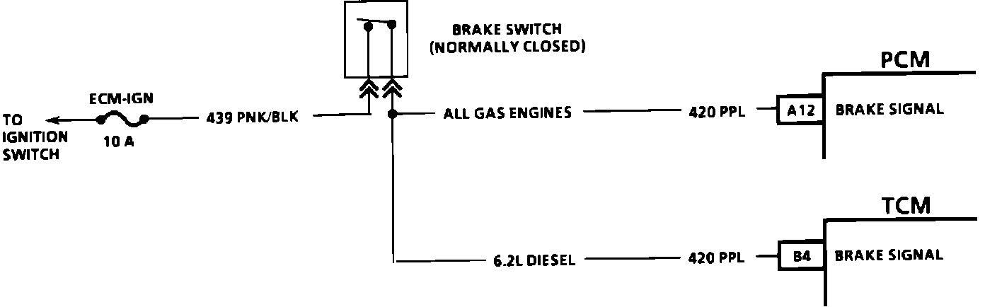 The normally closed brake switch supplies a 12 volt signal on CKT 420 to the PCM/TCM. The signal voltage is removed when the brakes are applied. An incorrect brake signal may affect TCC operation.