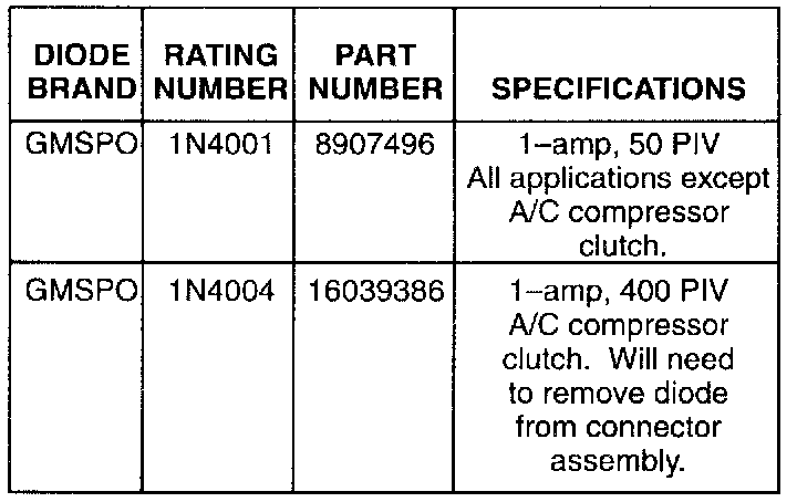 Many of the electrical systems in this vehicle use diodes to isolate certain circuits and protect them from voltage surges. Diode specifications and replacement part numbers are listed in illustration.
