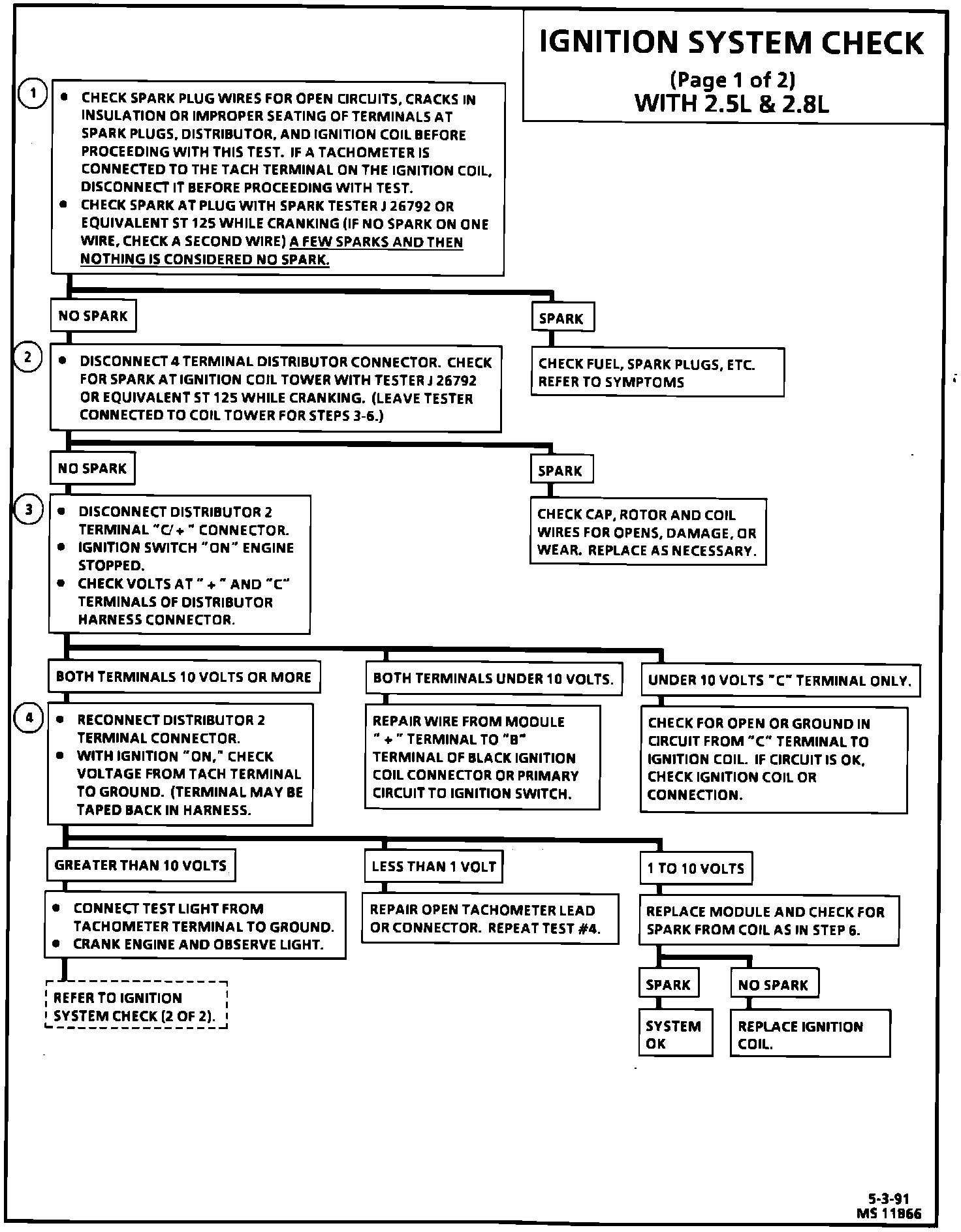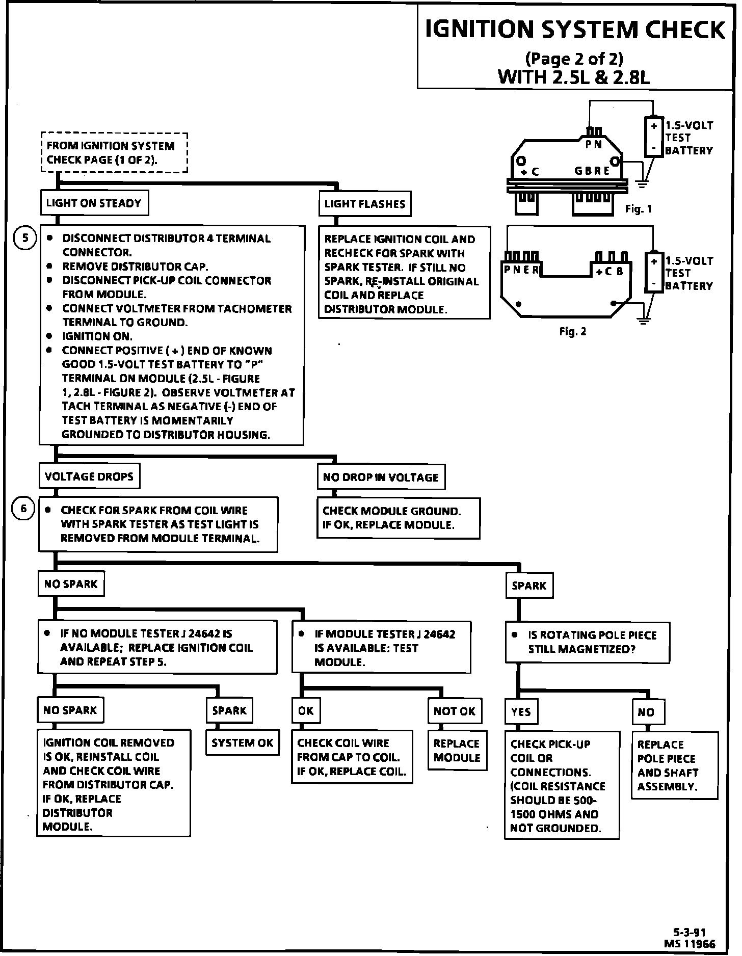 6. This should turn "OFF" the module and cause a spark. If no spark occurs, the fault is most likely in the ignition coil because most module problems would have been found before this point in the procedure. A module tester (J 24642) could determine which is at fault.