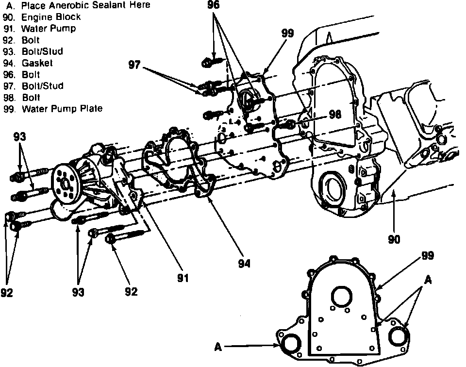 5. Remove water pump mounting bolts and plate, then the water pump.