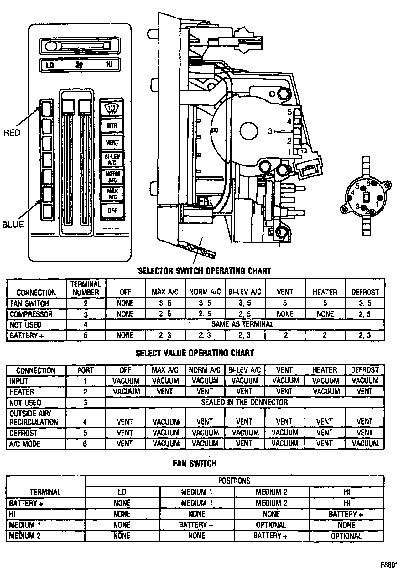 1. Operation of the air conditioning modes and blower at all speeds with the mode lever in any position except "OFF" and engagement of the compressor clutch would indicate that the electrical circuits are operating properly (accompanying figure).