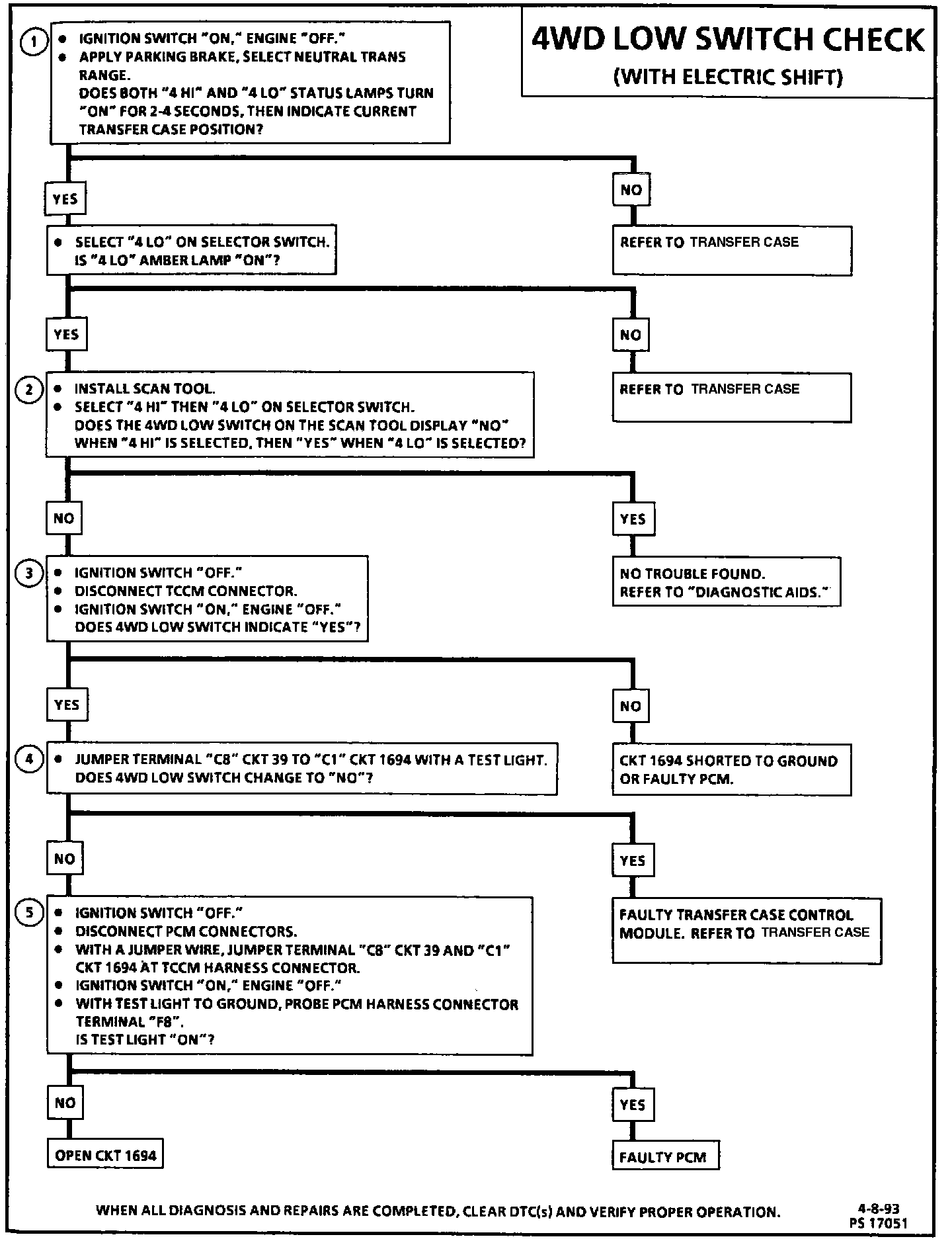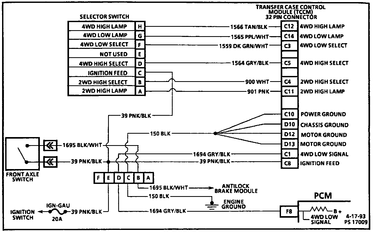 The 4WD low circuit consists of a selector switch assembly, Transfer Case Control Module (TCCM), front axle switch and wiring. When the operator selects 4WD low, a momentary signal will be sent from the selector switch to the TCCM. If all conditions for 4WD low have been met, the TCCM will allow the electric motor in the transfer case to make the shift. When 4WD low is engaged, CKT 1694 voltage to the PCM will change from B+ to zero. The 4WD low switch signal is used to correct the transmission output speed signal from the Vehicle Speed Signal (VSS) buffer module to the PCM, this signal is used to compensate for transfer case gear reduction. The PCM uses the transmission output speed signal to adjust shift points, line pressure and Torque Converter Clutch (TCC) scheduling.