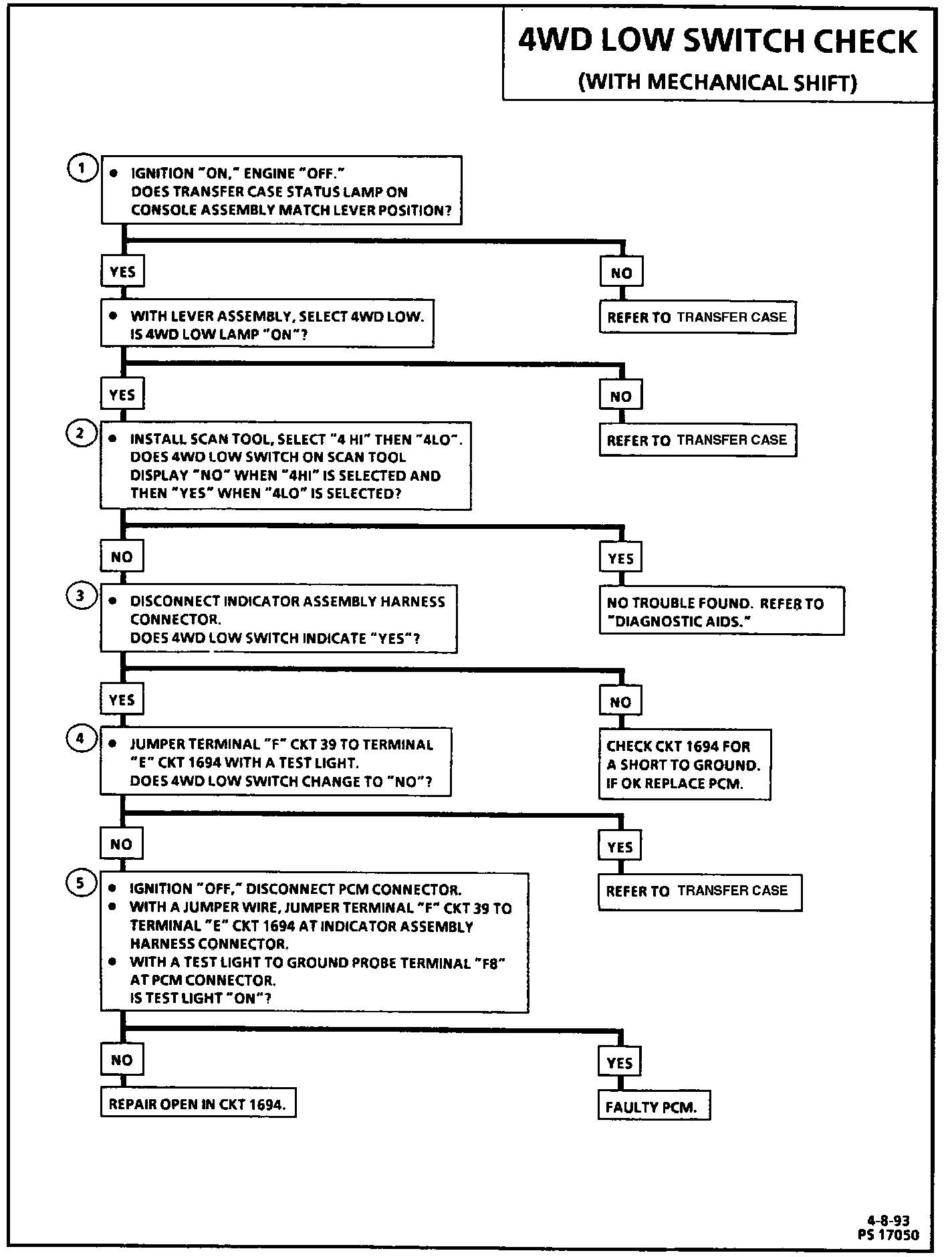 No DTC(s) will be set, however, if CKT 1694 is shorted to B+, the transmission will have late or no upshifts in 4WD low. If CKT 1694 is shorted to ground or open, the transmission will have an early shift pattern.