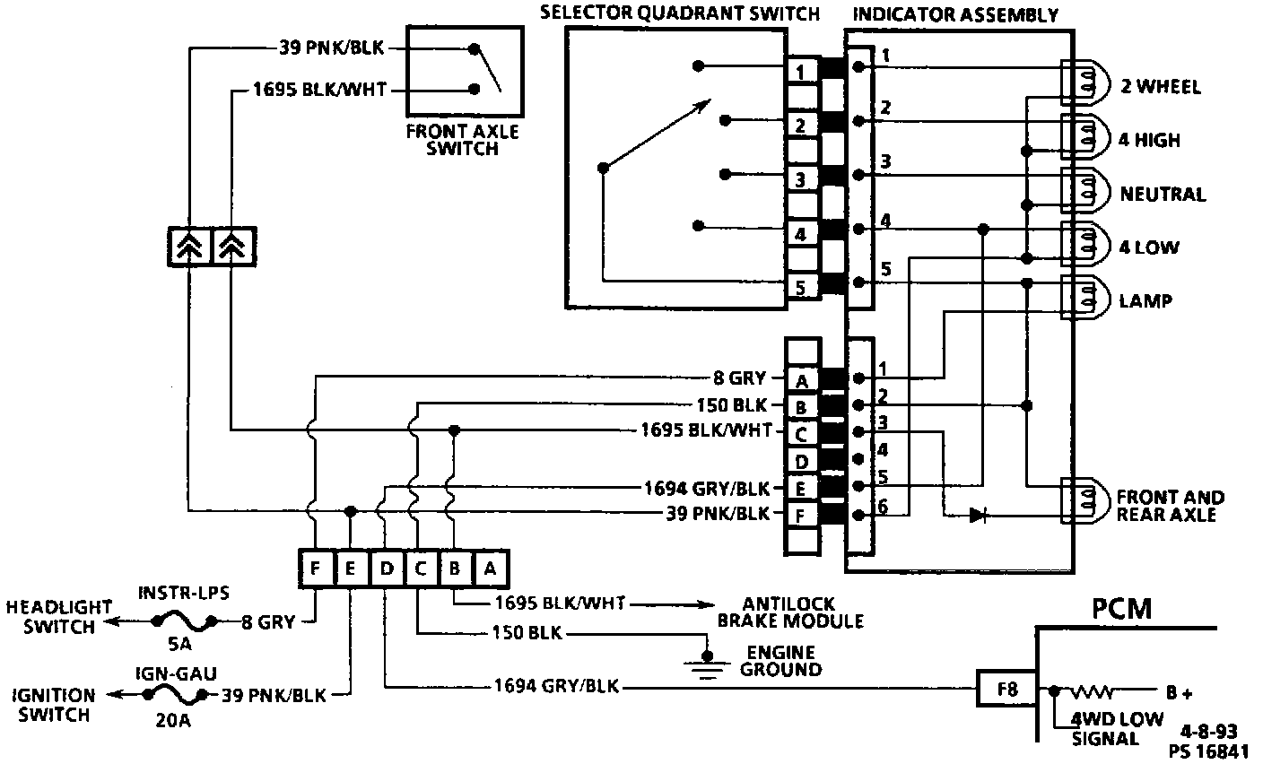 The 4WD low circuit consists of a 4WD indicator assembly, a selector switch assembly, front axle switch and wiring. When the operator moves the transfer case select lever to 4WD low, the selector switch completes CKT 39 to CKT 150. When the circuit is complete the 4WD low indicator lamp will illuminate, CKT 1694 to the PCM will change from B+ to zero. The front axle switch will close and complete CKT 1695 to CKT 150. The front axle switch will modify antilock brakes and illuminate the front axle lamp. The front axle switch does not effect CKT 1694 signal input to the PCM because the switch is also closed in the 4WD high position. The 4WD low switch signal is used to correct the transmission output speed signal from the Vehicle Speed Signal (VSS) Buffer Module to the PCM to compensate for transfer case gear reduction.