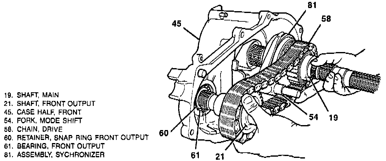 - Install mainshaft assembly, chain, and front output shaft into case as an assembly.