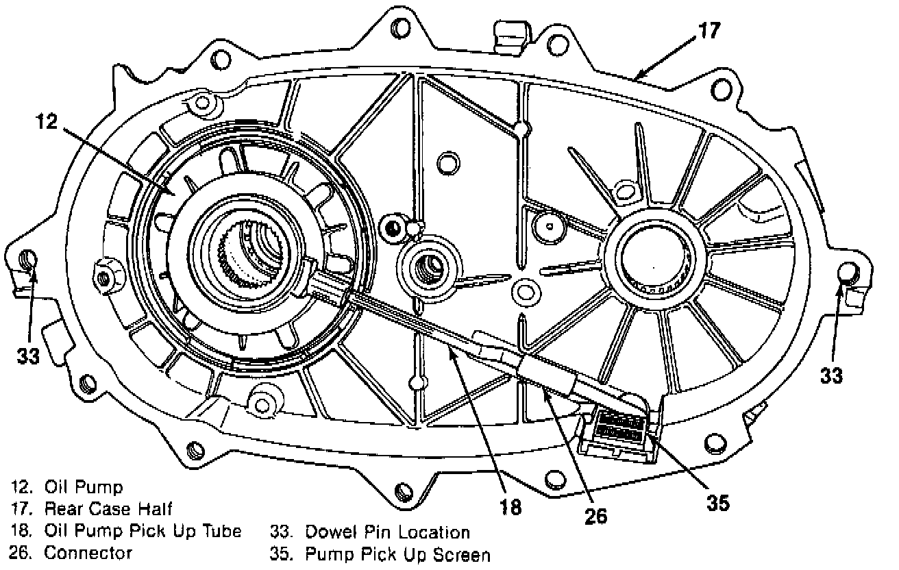 10. Oil pickup tube (18), oil tube connector (26), and pump pickup screen (35) into the rear case half (17).