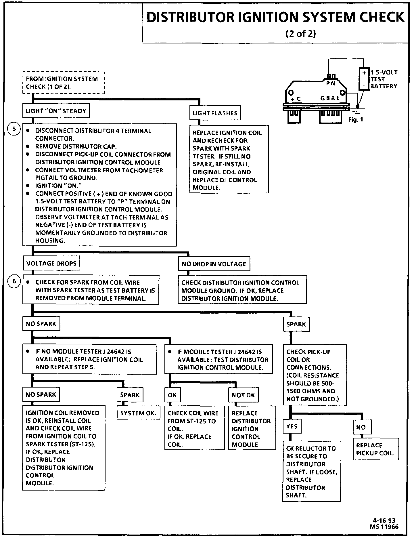 6. This should turn "OFF" the module and cause a spark. If no spark occurs, the fault is most likely in the ignition coil because most module problems would have been found before this point in the procedure. A distributor ignition control module tester (J 24642) could determine which is at fault.