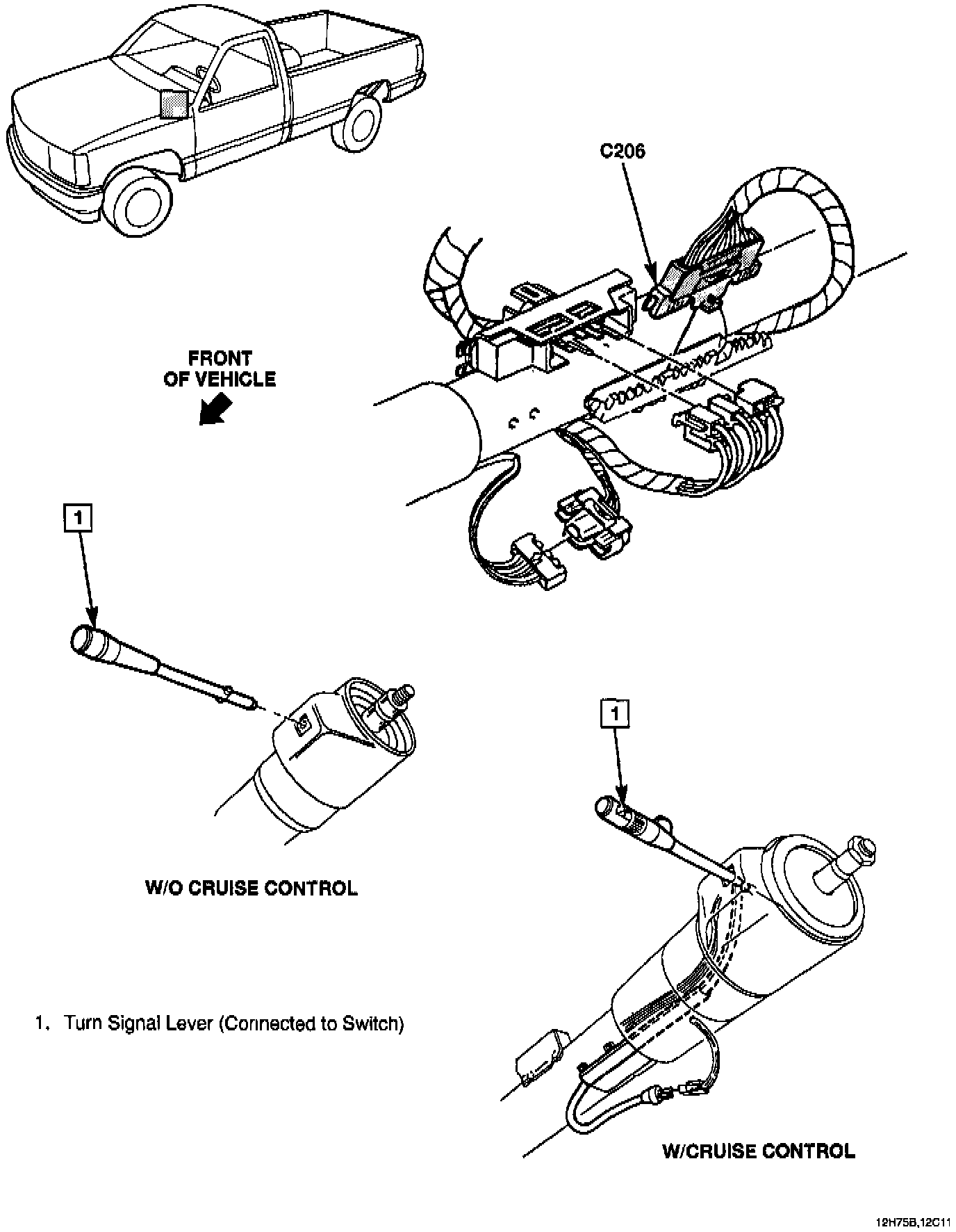 LH upper inside of steering column. The turn signal lever is part of multi-function switch.