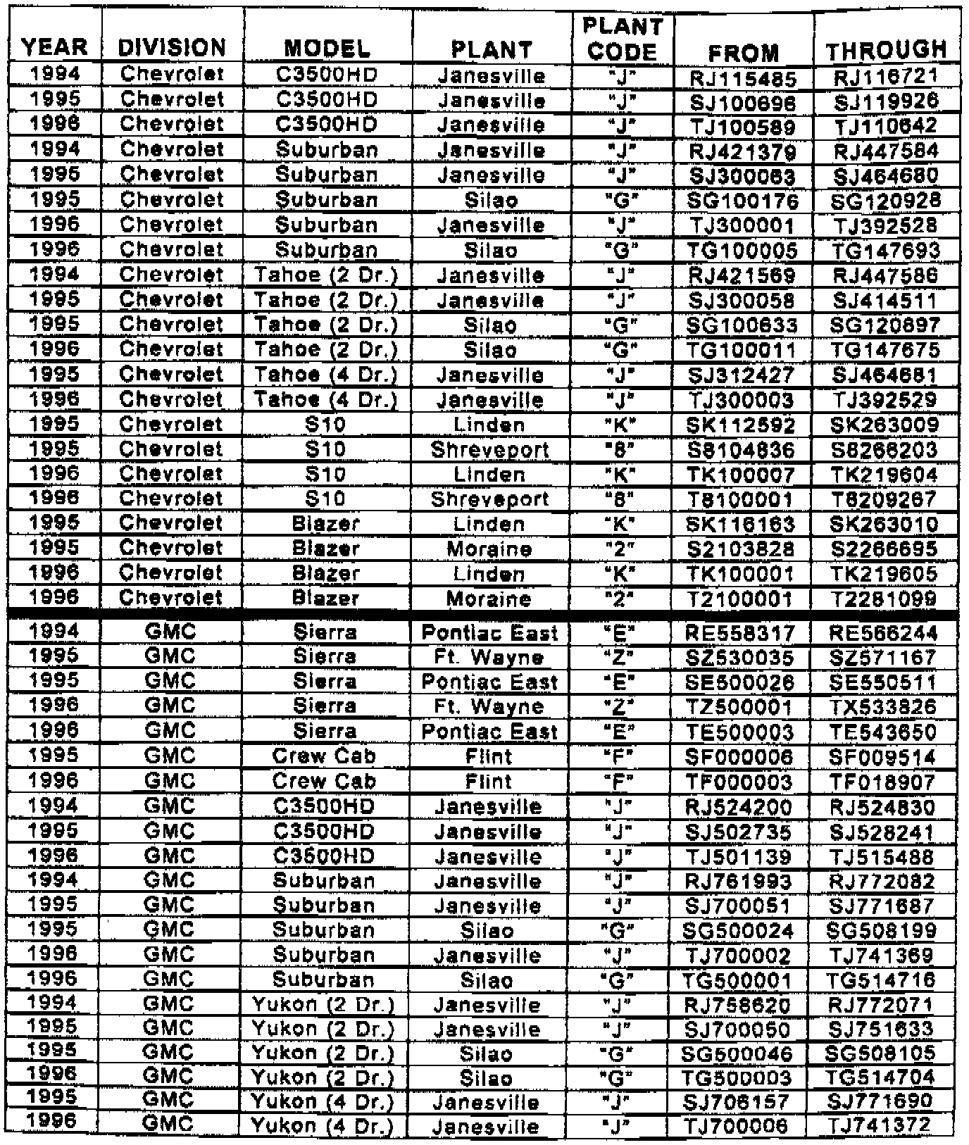 Involved are certain 1994-96 Chevrolet and GMC C/K model vehicles, and 1995-96 Chevrolet, GMC, and Oldsmobile S/T model vehicles built within the VIN breakpoints as shown.