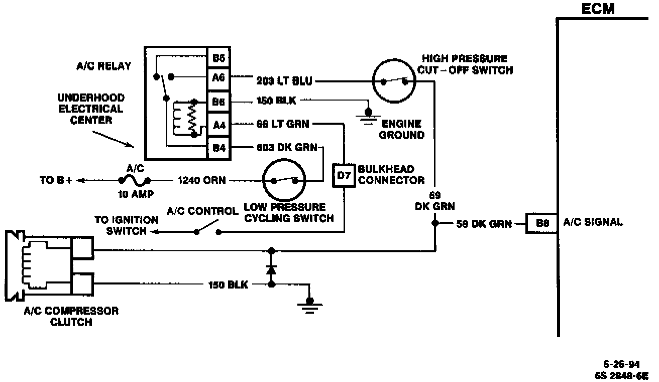 Turning "ON" the air conditioning supplies CKT 59 battery voltage to the A/C compressor clutch and to terminal "B8" of the ECM connector to increase and maintain idle speed.