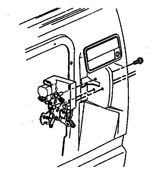 1. Pull outside handle out of door opening and slide latch outside door connector onto outside handle rod. Twist latch into door assembly and retain with three screws.