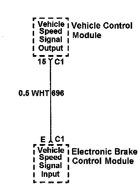 The rear wheel speed signal originates from the Vehicle Speed Sensor (VSS) which is connected to the Vehicle Control Module (VCM). The Electronic Brake Control Module (EBCM) receives the rear wheel speed signal from the VCM.